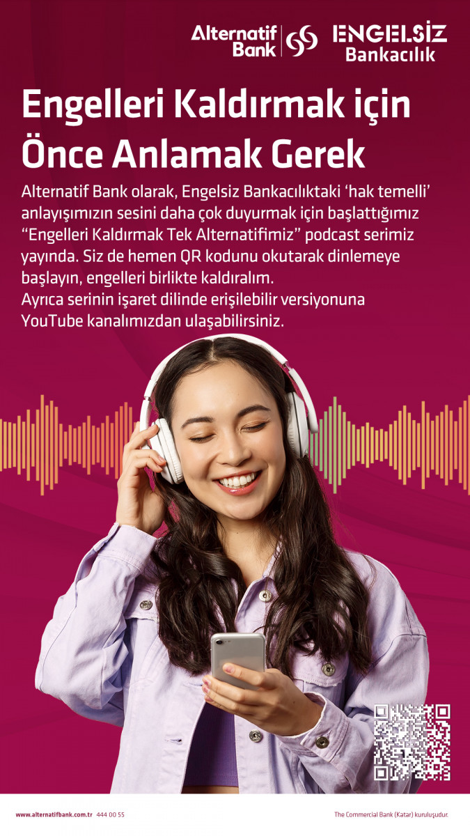 Alternatif Bank, herkes için hak temelli ve erişilebilir bir bankacılık deneyimi oluşturmak için Engelsiz Bankacılık çalışmalarını yeni projelerle genişletmeye devam ediyor. Banka, son olarak ‘Engelsiz Bankacılık’ çalışmalarının sonucunda elde ettiği bilgi birikimini kalıcı hale getirmek ve herkesin erişimine sunmak amacıyla “Engelleri Kaldırmak Tek Alternatifimiz” başlıklı podcast serisini hayata geçirdi.