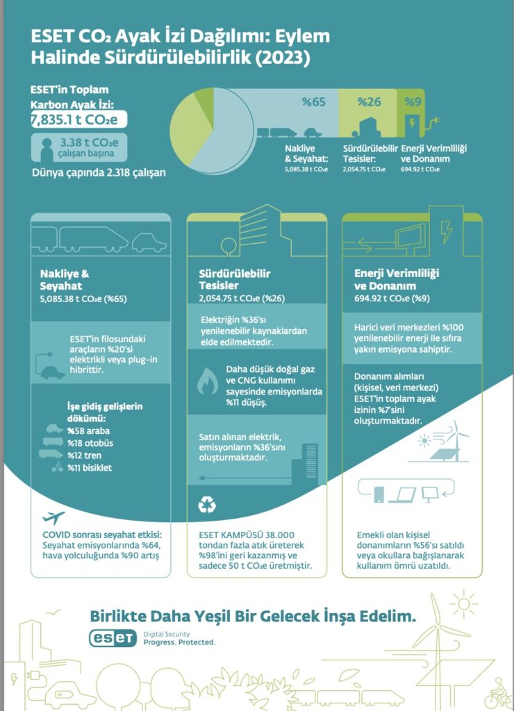 Siber güvenlik çözümlerinde dünya lideri olan ESET, 2023 Karbon Ayak İzi Raporu’nu yayımladı. Rapor ESET’in şeffaflık, hesap verebilirlik ve çevresel sürdürülebilirliğe olan bağlılığının altını çiziyor; şirketin çevresel etkisini azaltma ve net sıfır geleceğe doğru ilerleme çabalarını yansıtıyor.
