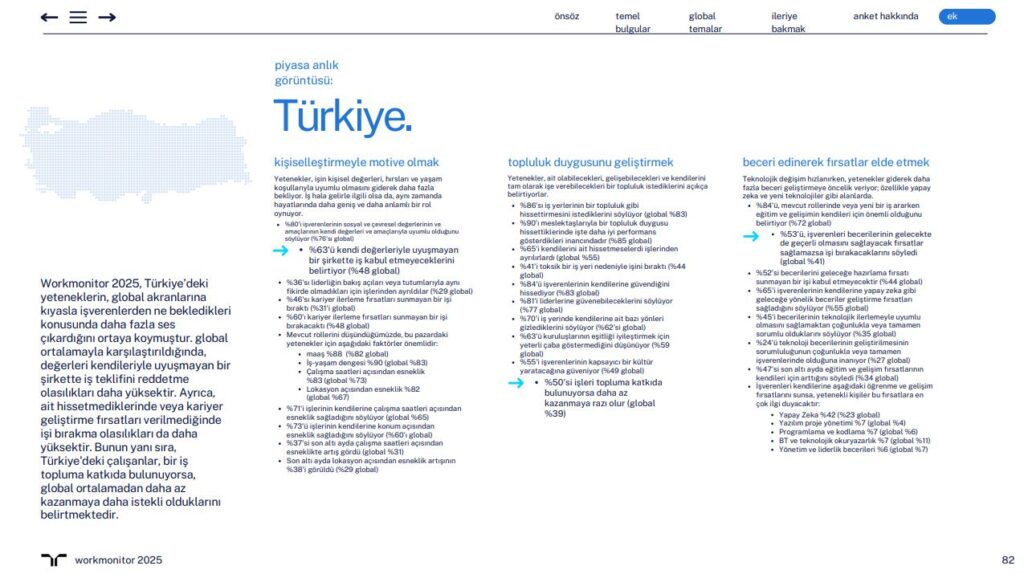 Workmonitor tarihinde ilk kez %83’e karşı %82 oranla iş-yaşam dengesi ücretten daha önemli görülüyor. Bu oran Türkiye’de %90’a karşı %88 ile global rakamların üzerinde gerçekleşiyor. Rapor, yeteneklerin kişiselleştirmeye, topluluğa ve beceriler konusunda geleceğe hazırlanmaya öncelik verdiğini ve işverenlerin bu ihtiyaçlara kulak vermesi gerektiğini gösteriyor. Yetenekler, beklentileri karşılanmadığı takdirde harekete geçiyor; katılımcıların neredeyse yarısı (%45) daha iyi iş koşulları için mücadele ettiklerini söylüyor. Bu durum globalde çalışanların %44’ünün, Türkiye’de ise %41’inin işyerlerinin toksik atmosfere sahip olduğunu düşündükleri için işten ayrıldıklarını bildirmesiyle de kanıtlanıyor; bu oran globalde geçen yıla göre %33’ün üzerinde bir artışa işaret ediyor.
