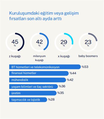 Workmonitor, öğrenme ve gelişimin yetenek için önemli olmaya devam ettiğini ancak beklentiler ve gerçekler arasında bir uçurum bulunduğunun altını çiziyor. Geçen yıl katılımcıların %29’u, kariyerlerini geleceğe hazırlayacak gelişim fırsatları sağlanmazsa işi bırakacaklarını söylemişti; bu yıl bu oran keskin bir şekilde %41’e yükseldi. Yapay zeka en çok aranan öğrenme ve gelişim fırsatı iken (%23), bunu BT ve teknolojik okuryazarlık (%11) ile yönetim ve liderlik becerileri (%7) takip ediyor. Türkiye’deki katılımcılar ise beklentiler konusunda %53 ile global ortalamaların 12 puan üzerinde. Türkiye’deki çalışanlardan %42’si (Baby Boomer kuşağının %39’u, Z kuşağının ise %34’ü) yapay zeka konusunda eğitilmek istiyor.