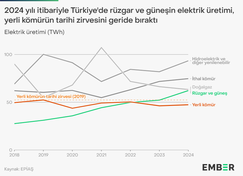 Rüzgar ve güneş enerjisi 2024 yılında 62 TWh enerji üreterek üst üste ikinci kez yerli kömürün (47 TWh) önüne geçti. Hatta yerli kömürün tarihi zirvesi olan 2019’daki 53 TWh’lik elektrik üretimini bile geçti ki bu, söz konusu durumun kalıcı olabileceğine işaret ediyor. Ember Türkiye ve Kafkaslar Bölge Lideri Ufuk Alparslan, “Rüzgar ve güneşin yerli kömürden elektrik üretimini geride bırakmış olması Türkiye için önemli bir dönüm noktası ve rüzgar ve güneş enerjisinin artık ülkenin enerji güvenliğinin önemli bir parçası olduğunu gösteriyor.” dedi.